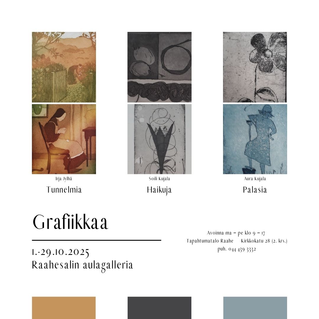 Lokakuussa aulagalleriassa on esillä Aura Kujalan, Soili Kujalan ja Irja Jylhän grafiikkaa. Teoskokonaisuuksien nimet Tunnelmia, Haikuja ja Palasia kuvaavat hyvin näyttelyn töitä. Nämä ihastuttavat tunnelmalliset ja kauniit työt luovat rauhallisen lämpöisen tunnelman ja ovat kuin palasia muistoista.